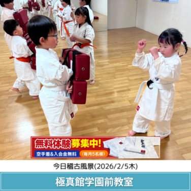 学園前教室の稽古風景 今日の学園前教室(2026/2/5木) 強く、やさしく、たくましく。🥋✨ 極真館 学園前教室は、 明るく・真面目に・楽しく空手に取り組める道場を目指しています。 今日は年少の男の子が無料体験に来てくれました! 本日の稽古も元気いっぱい💪✨ みんなで楽しく汗を流しました! ーーーー... 2026.02.05 学園前教室の稽古風景